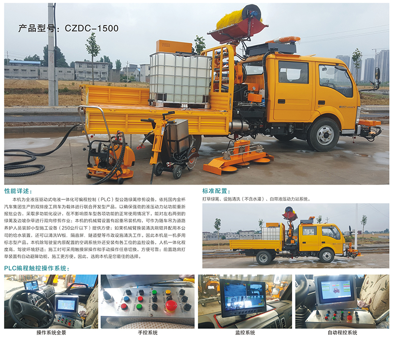 綠籬機(jī)是全液壓驅(qū)動式電液一體化可編程控制型的公路綠籬修剪設(shè)備,依托國內(nèi)金杯汽車集團(tuán)生產(chǎn)的雙排座工具車為載體進(jìn)行聯(lián)合開發(fā)型產(chǎn)品,確保強(qiáng)勁的液壓動力站功能重新報(bào)批公告,采取多功能化設(shè)計(jì),在不影響原車型各項(xiàng)功能的正常使用情況下,能對左右兩側(cè)的綠籬及邊坡雜草進(jìn)行雙向修剪作業(yè)。
