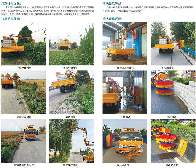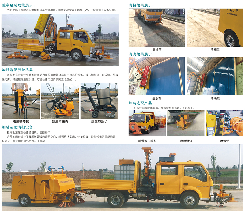 本機(jī)的機(jī)械臂設(shè)置有起重吊裝機(jī)構(gòu),可作為隨車吊為道路養(yǎng)護(hù)人員裝卸小型施工設(shè)備(250公斤以下)提供方便;如果機(jī)械臂換裝清洗刷輥并配用鑫奧機(jī)械生產(chǎn)的給水裝置,還可以清洗W板、隔音屏、隧道等市政設(shè)施清洗工作。
